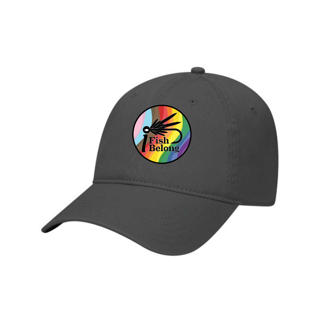 Fly Fishing hat. 6 panel, low profile, unstructured, soft crown, dad hat with buckle closure. Woven progressive iFishiBelong logo placed in the left corner of the hat. Size fits most.